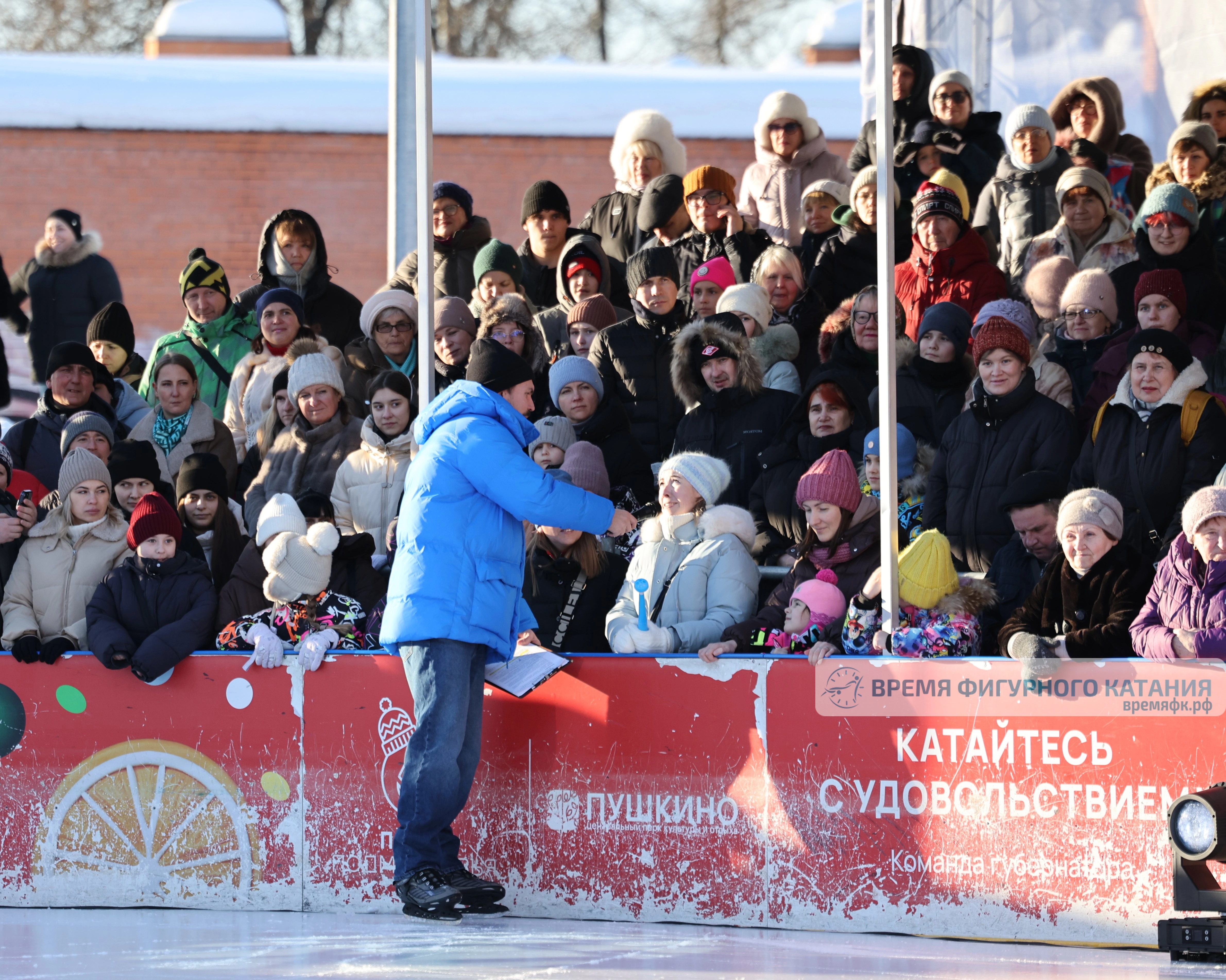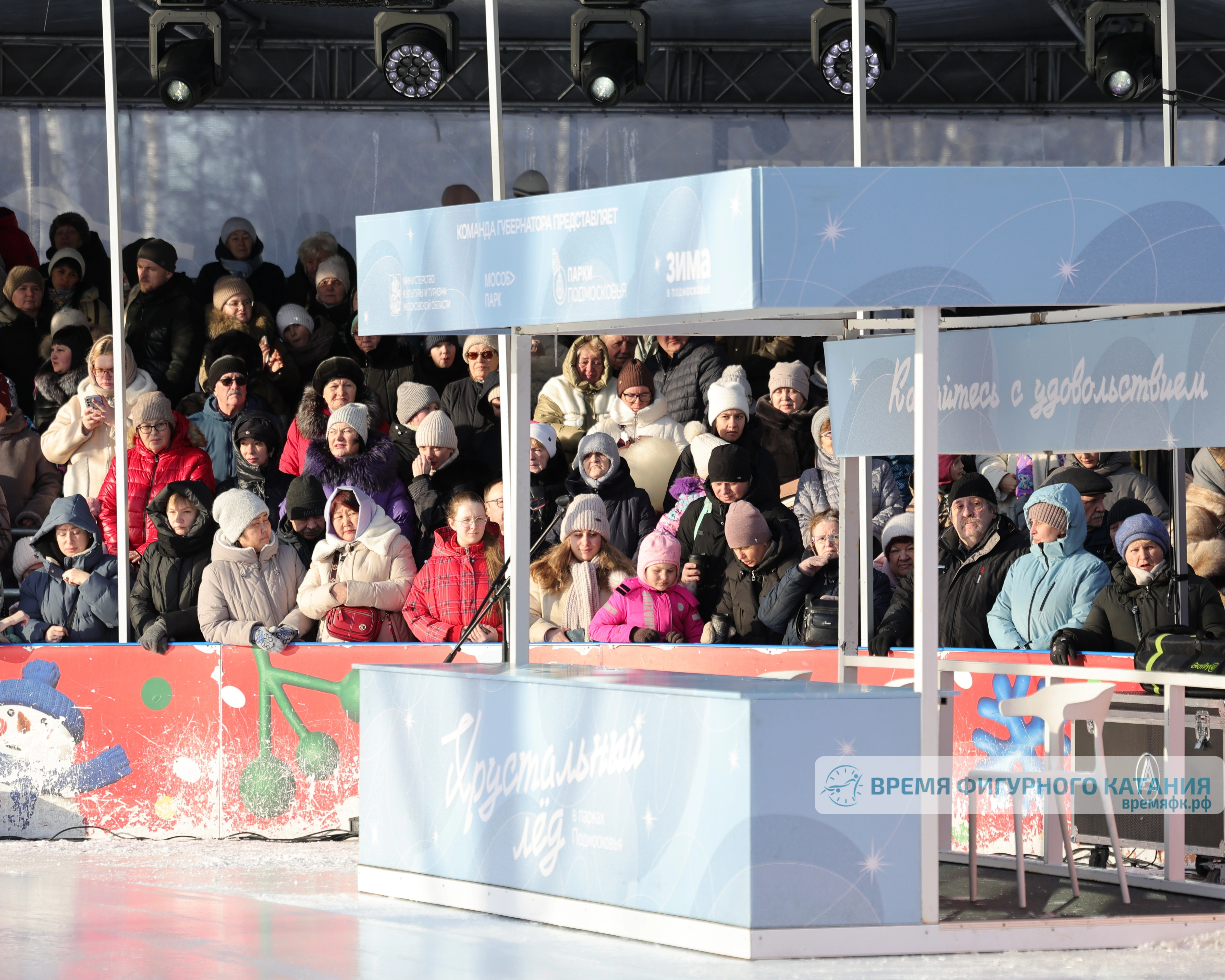 Еще до начала фестиваля на трибуне и вокруг катка собралась большая публика. В ожидании конкурсных выступлений ведущий брал интервью и репетировал со зрителями формы поддержки, шутил и в целом способствовал созданию атмосферы как на настоящих больших аренах.