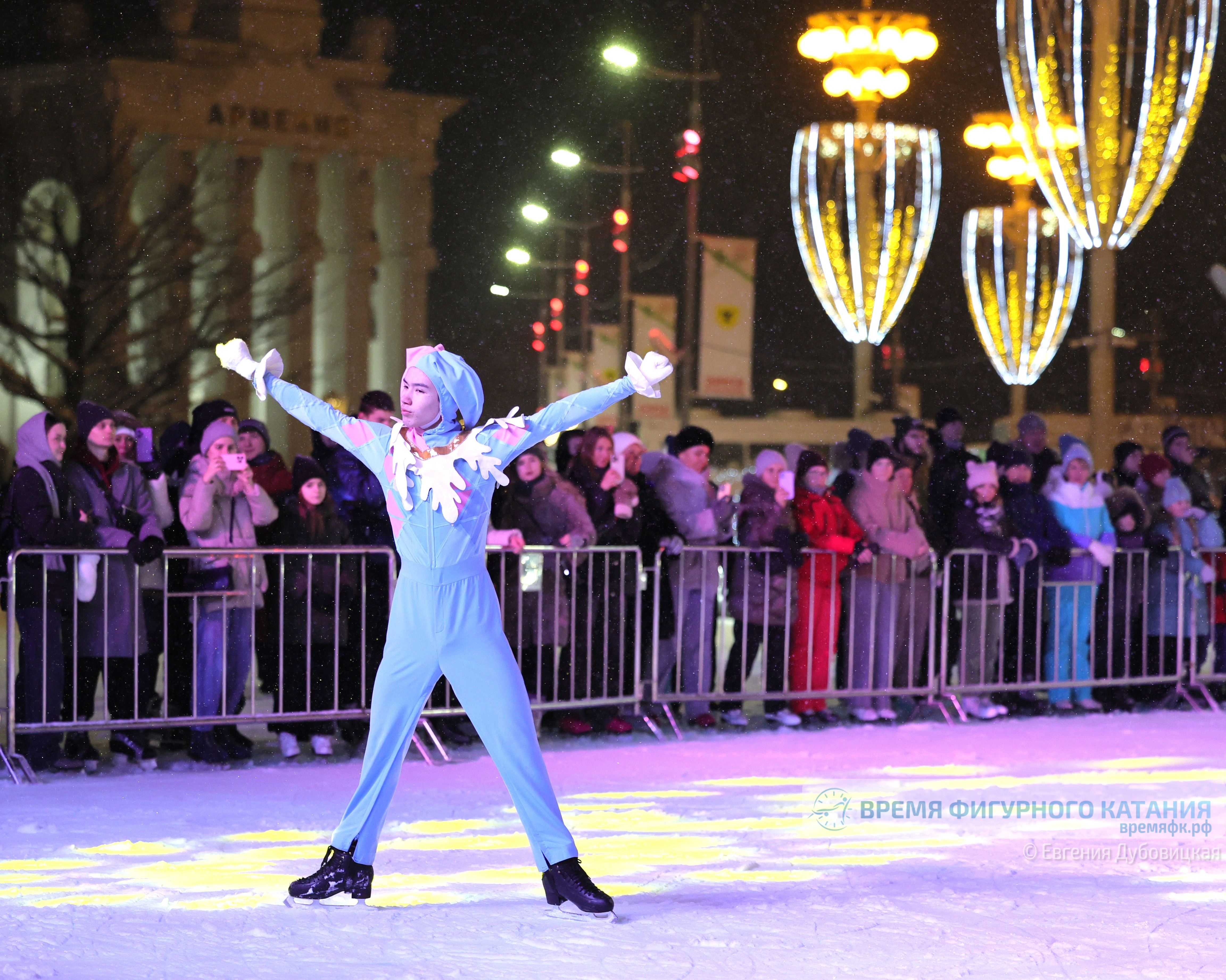 Ледовое шоу можно было посмотреть как находясь на льду, предварительно купив билет на каток, так и бесплатно с трибуны. И здесь хотелось остановиться на организационном моменте. Например, в сезоне 2023-2024, когда каток заливали на площади Промышленности вокруг ракеты "Восток", площадка для выступления располагалась так, что с одной стороны можно было наблюдать действие со льда, с другой разместиться на трибуне, при этом на минимальном расстоянии.